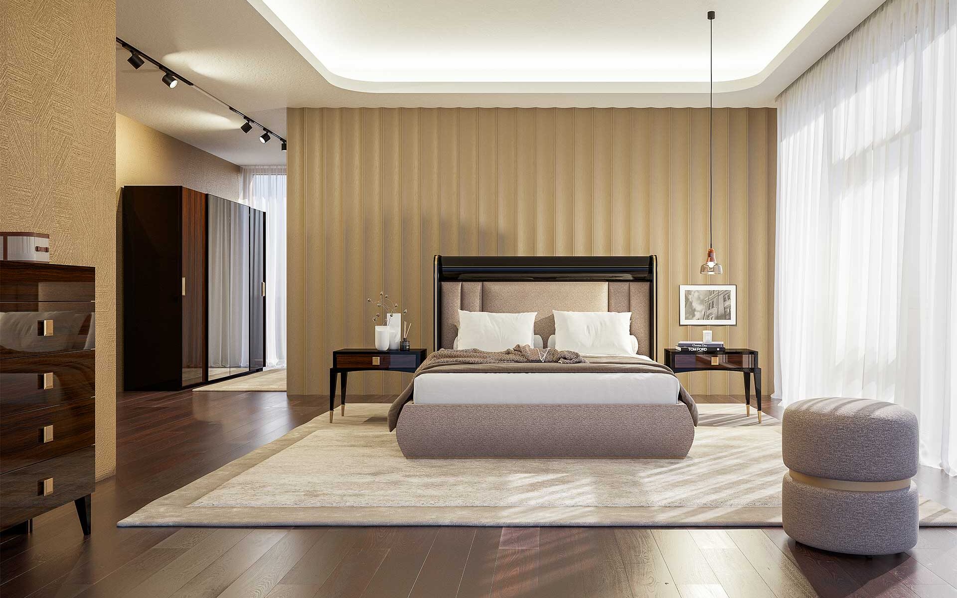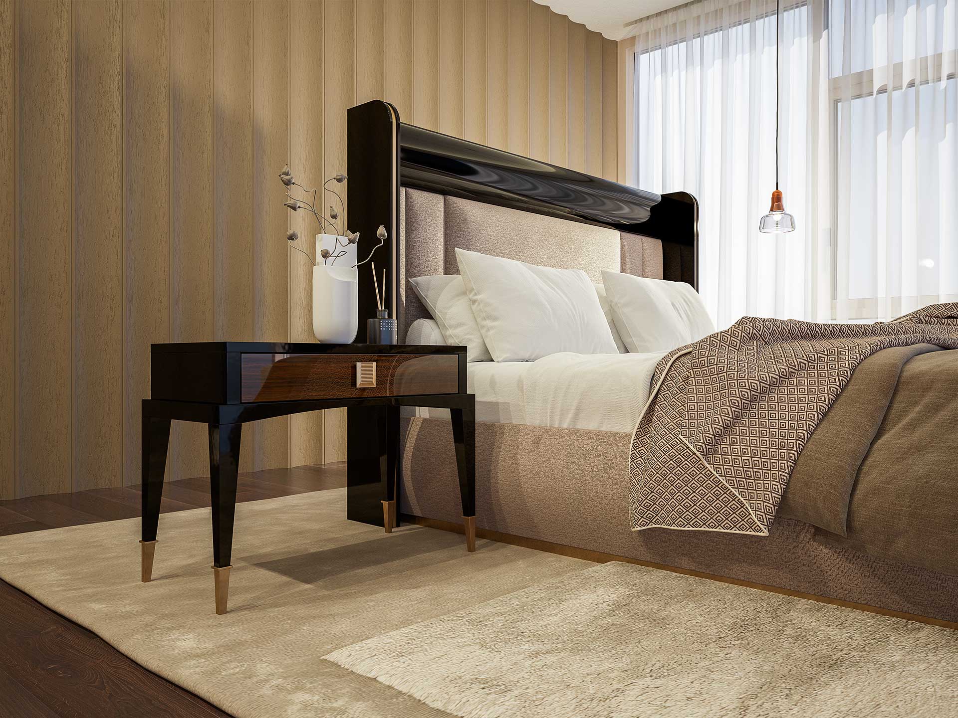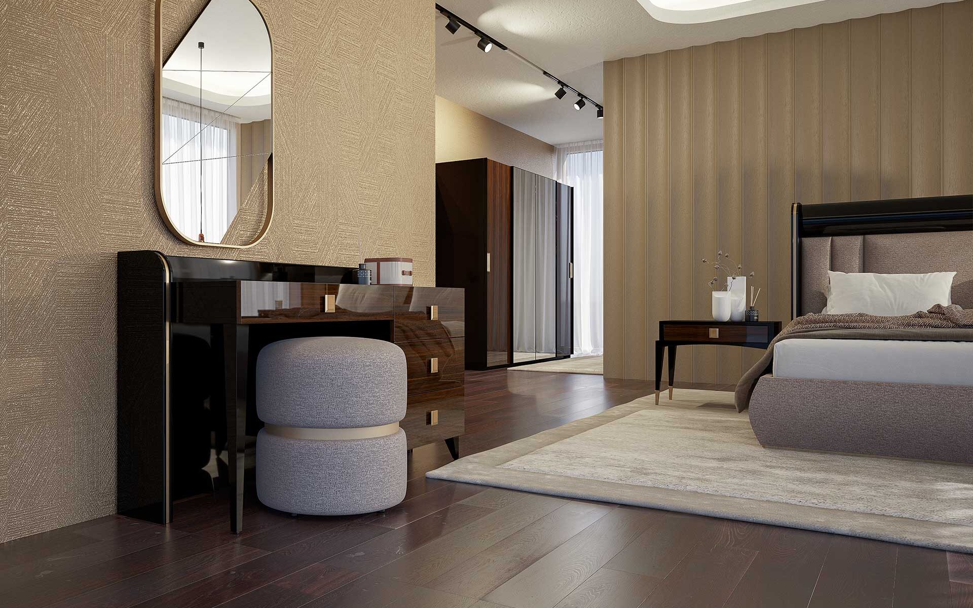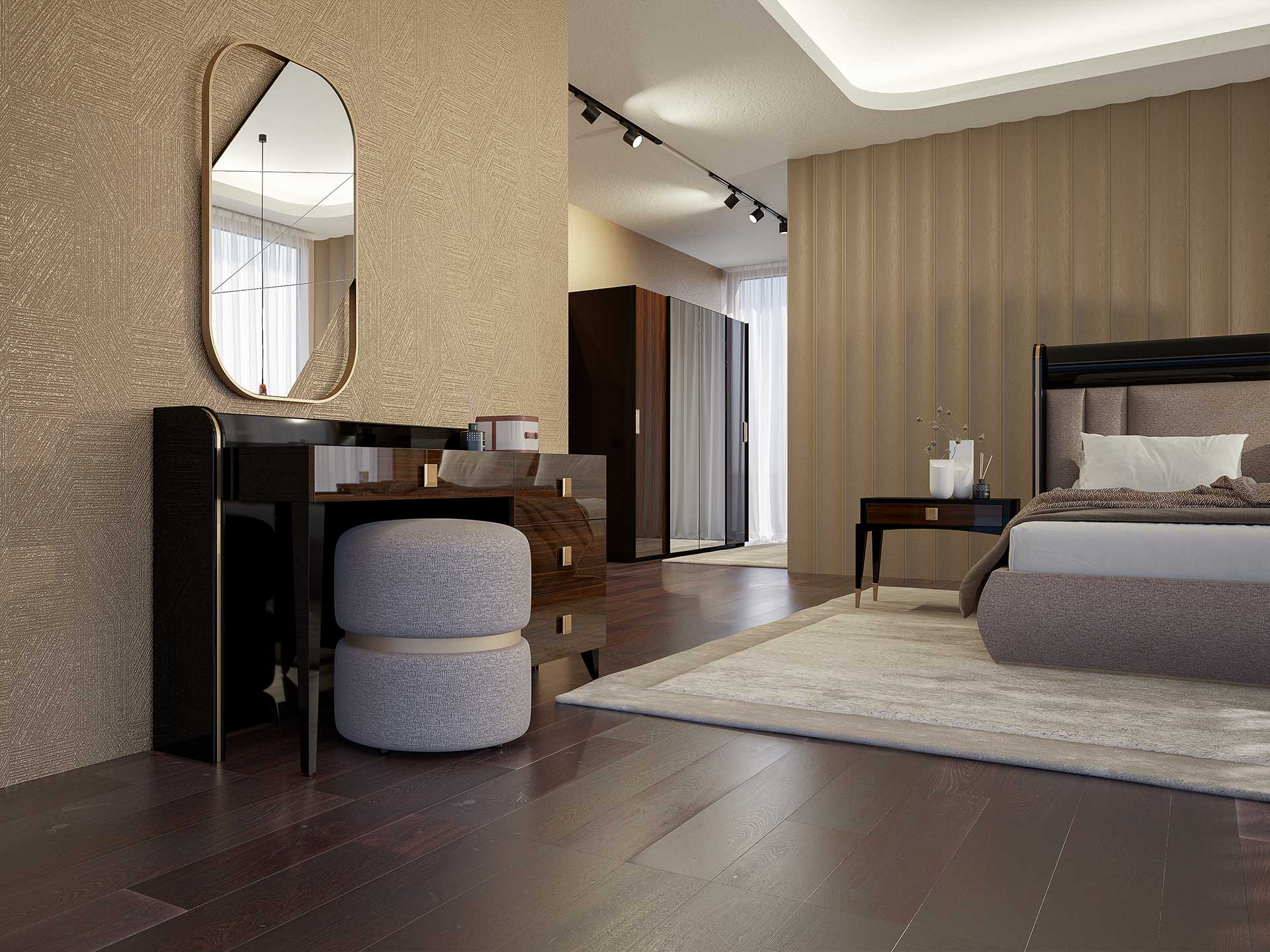 Dhoma e Gjumit Kant, e dizajnuar për t'ju bërë të ndiheni të veçantë, ofron një pamje madhështore me ngjyrën e zezë të lyer dhe detajet e bronzës së vjetëruar. Duke bashkuar funksionalitetin me elegancën, Kant përdor dyer xhami me pasqyrë të lëvizshme dhe sinkronizuar në gardërobë, duke ofruar një hapësirë të gjerë ruajtjeje pas tyre.