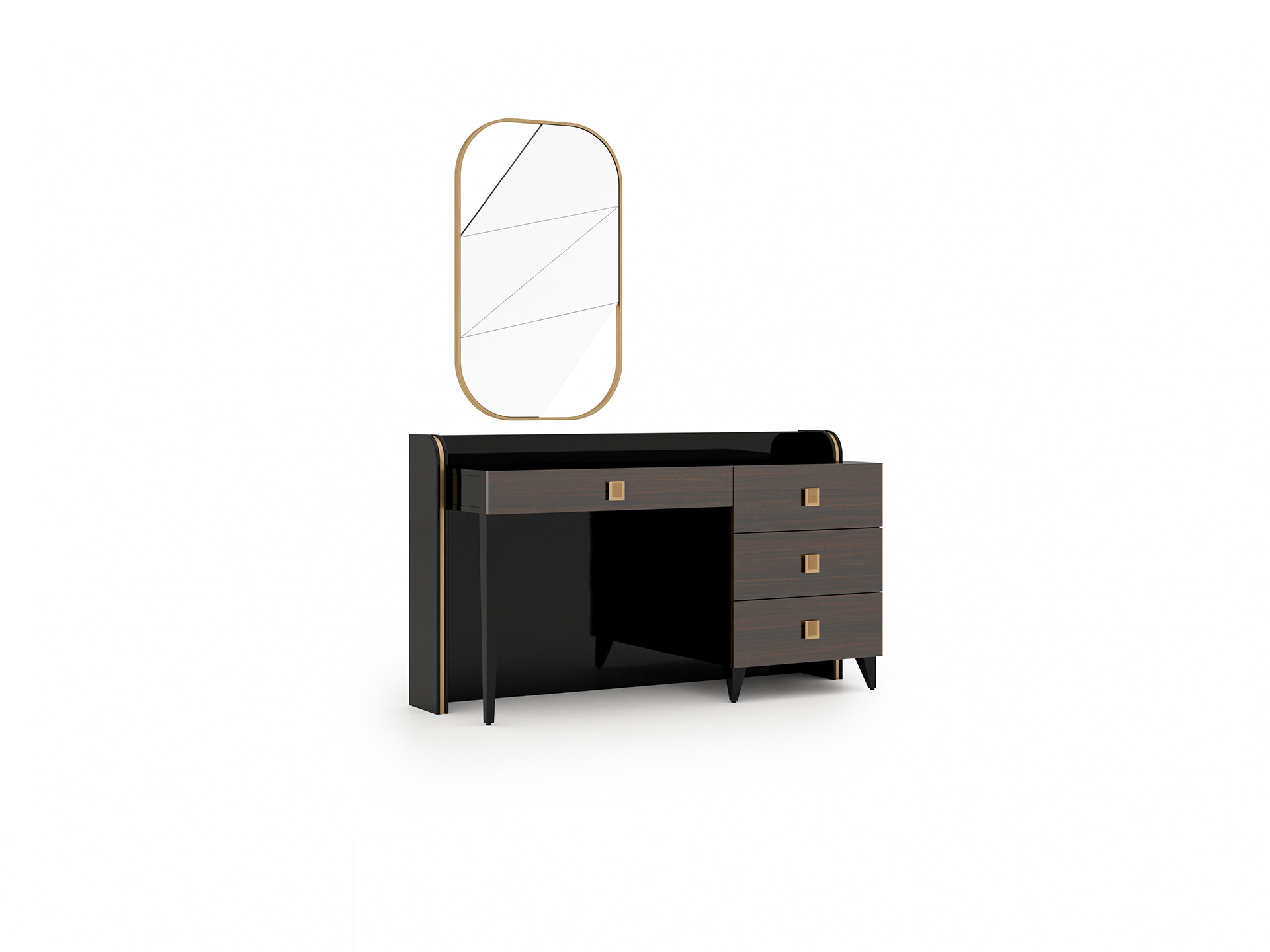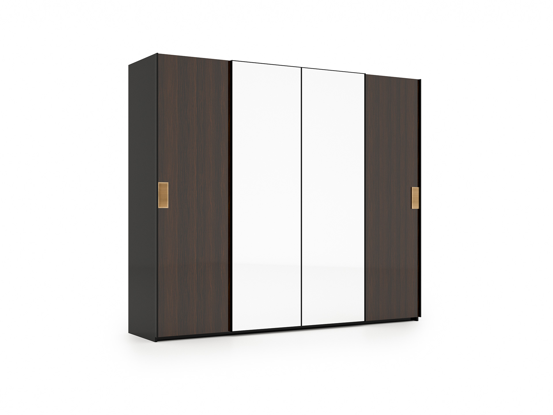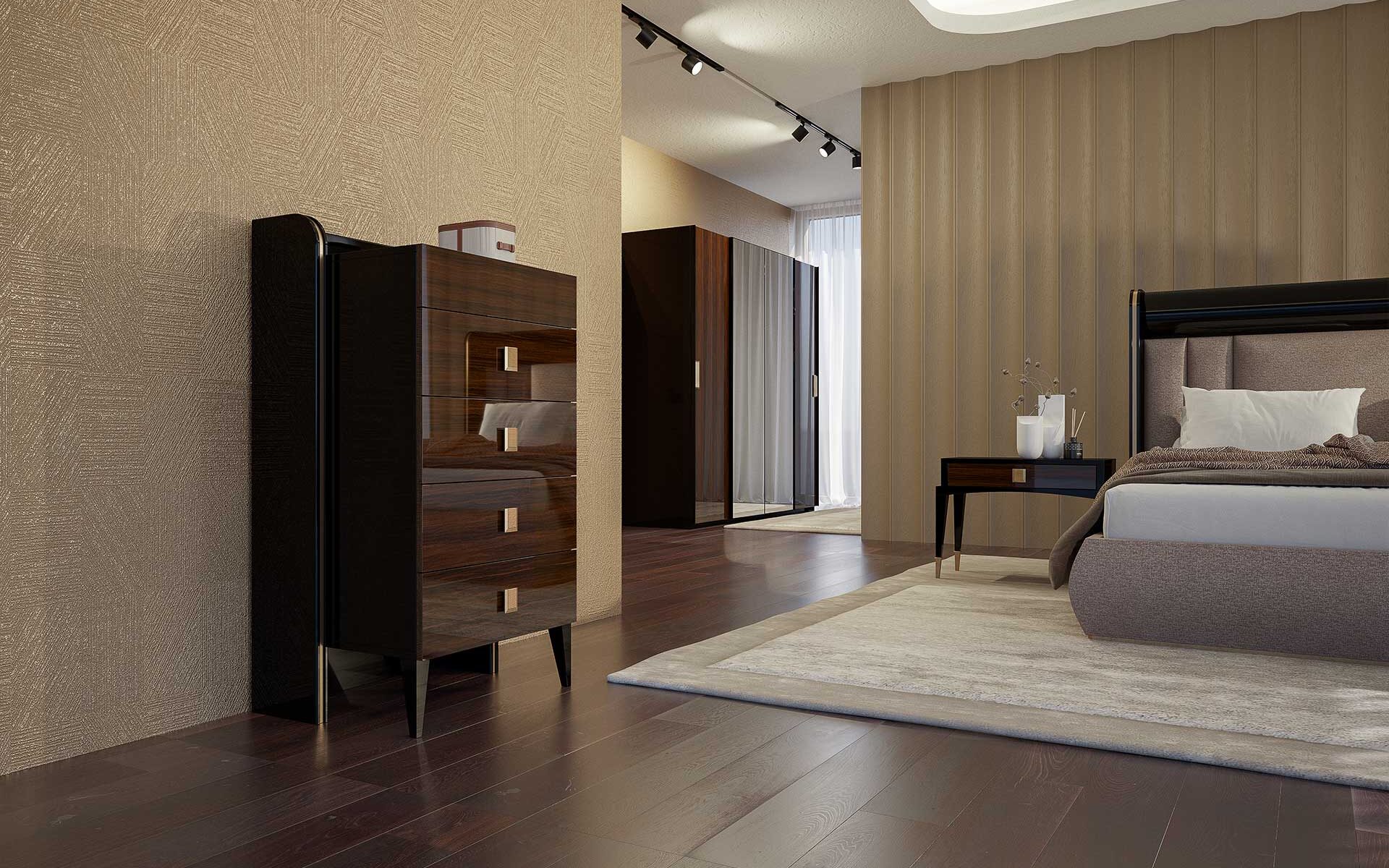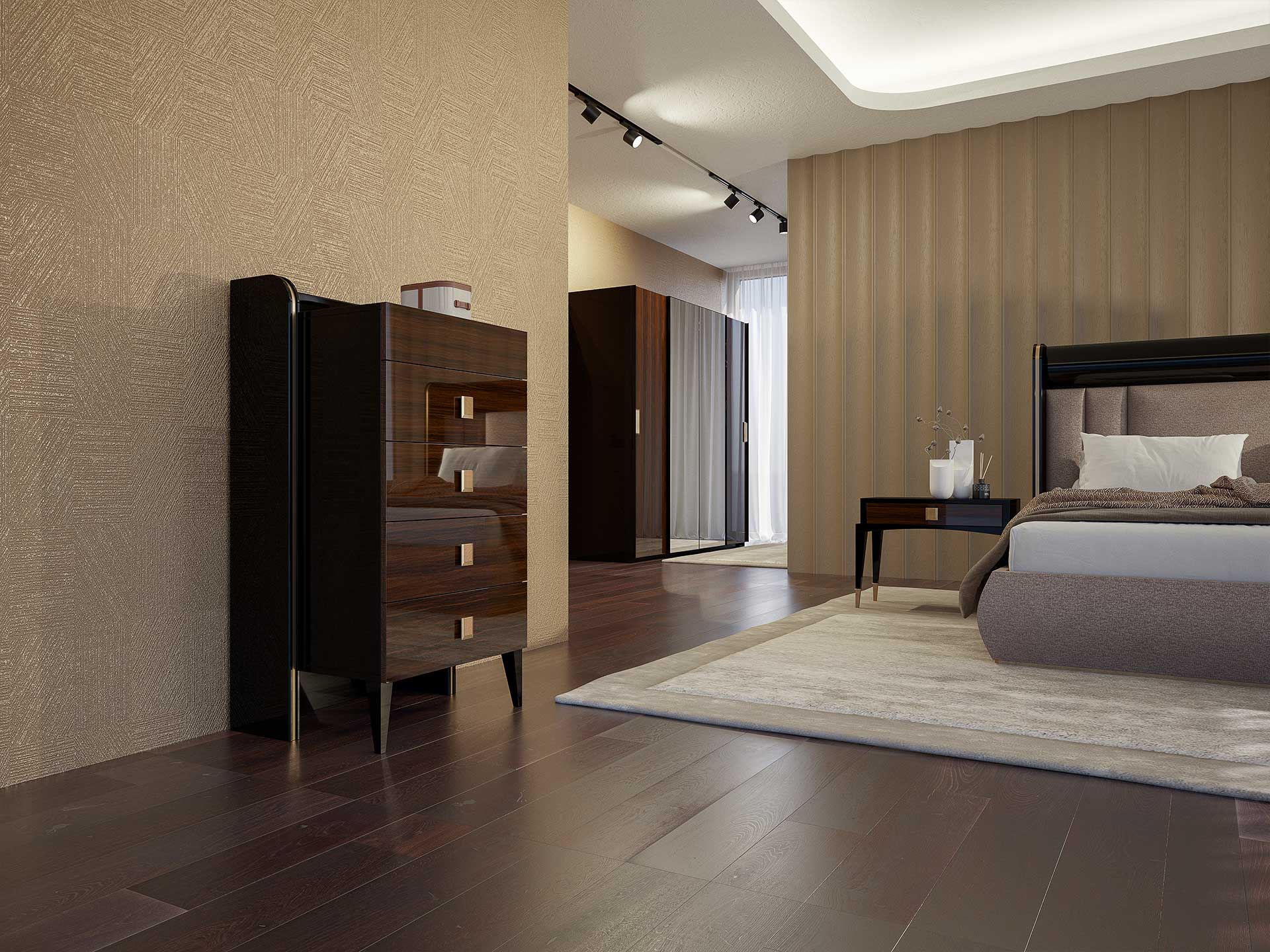 Dhoma e Gjumit Kant, e dizajnuar për t'ju bërë të ndiheni të veçantë, ofron një pamje madhështore me ngjyrën e zezë të lyer dhe detajet e bronzës së vjetëruar. Duke bashkuar funksionalitetin me elegancën, Kant përdor dyer xhami me pasqyrë të lëvizshme dhe sinkronizuar në gardërobë, duke ofruar një hapësirë të gjerë ruajtjeje pas tyre.