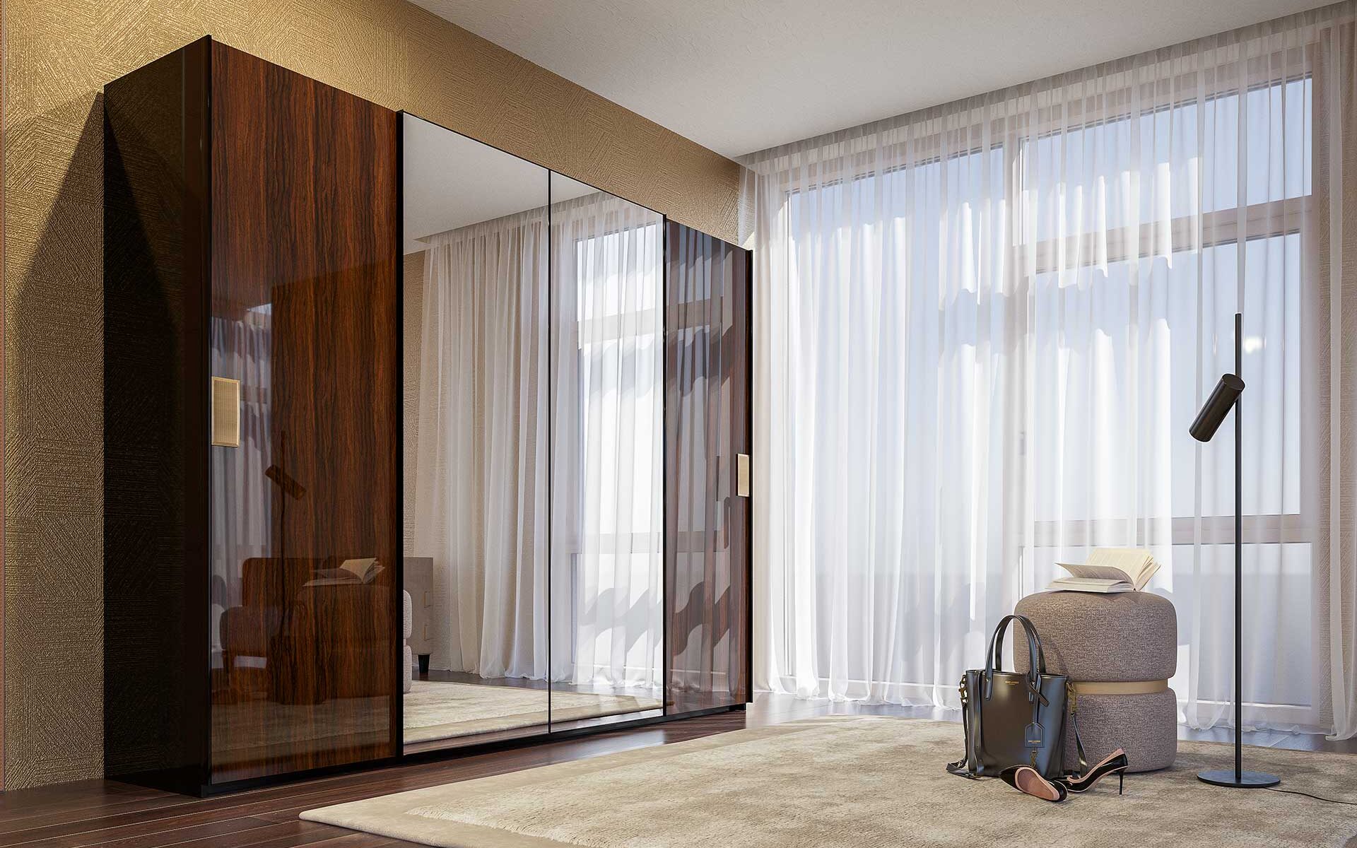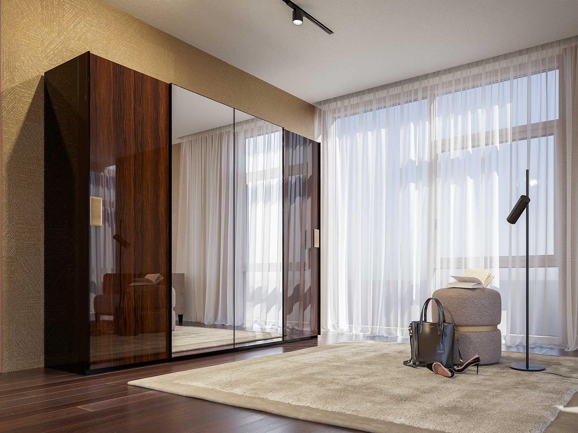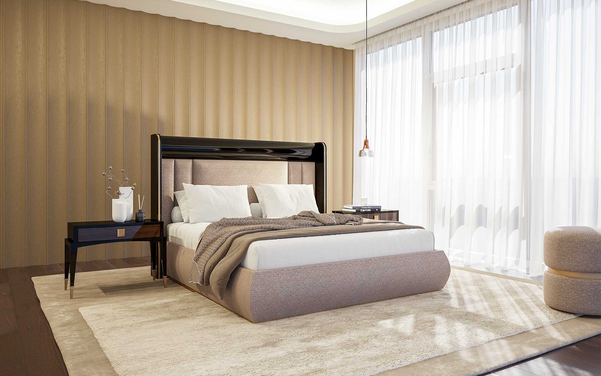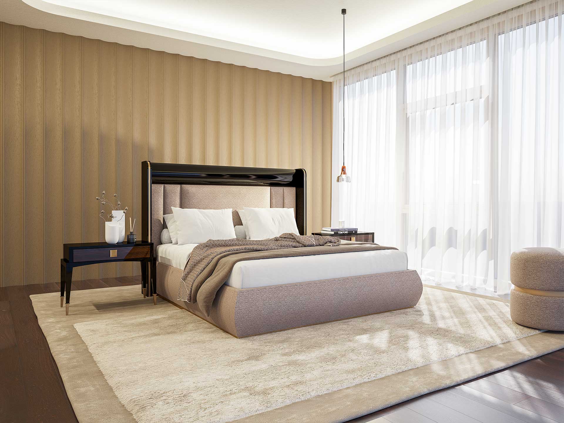Dhoma e Gjumit Kant, e dizajnuar për t'ju bërë të ndiheni të veçantë, ofron një pamje madhështore me ngjyrën e zezë të lyer dhe detajet e bronzës së vjetëruar. Duke bashkuar funksionalitetin me elegancën, Kant përdor dyer xhami me pasqyrë të lëvizshme dhe sinkronizuar në gardërobë, duke ofruar një hapësirë të gjerë ruajtjeje pas tyre.