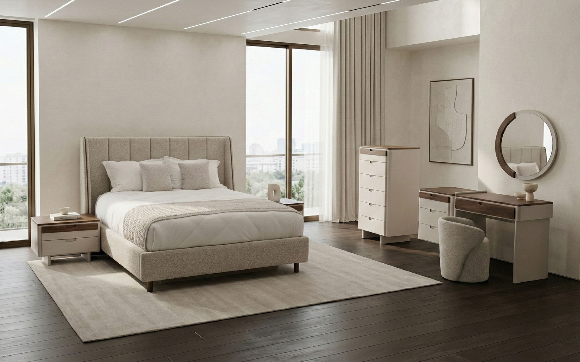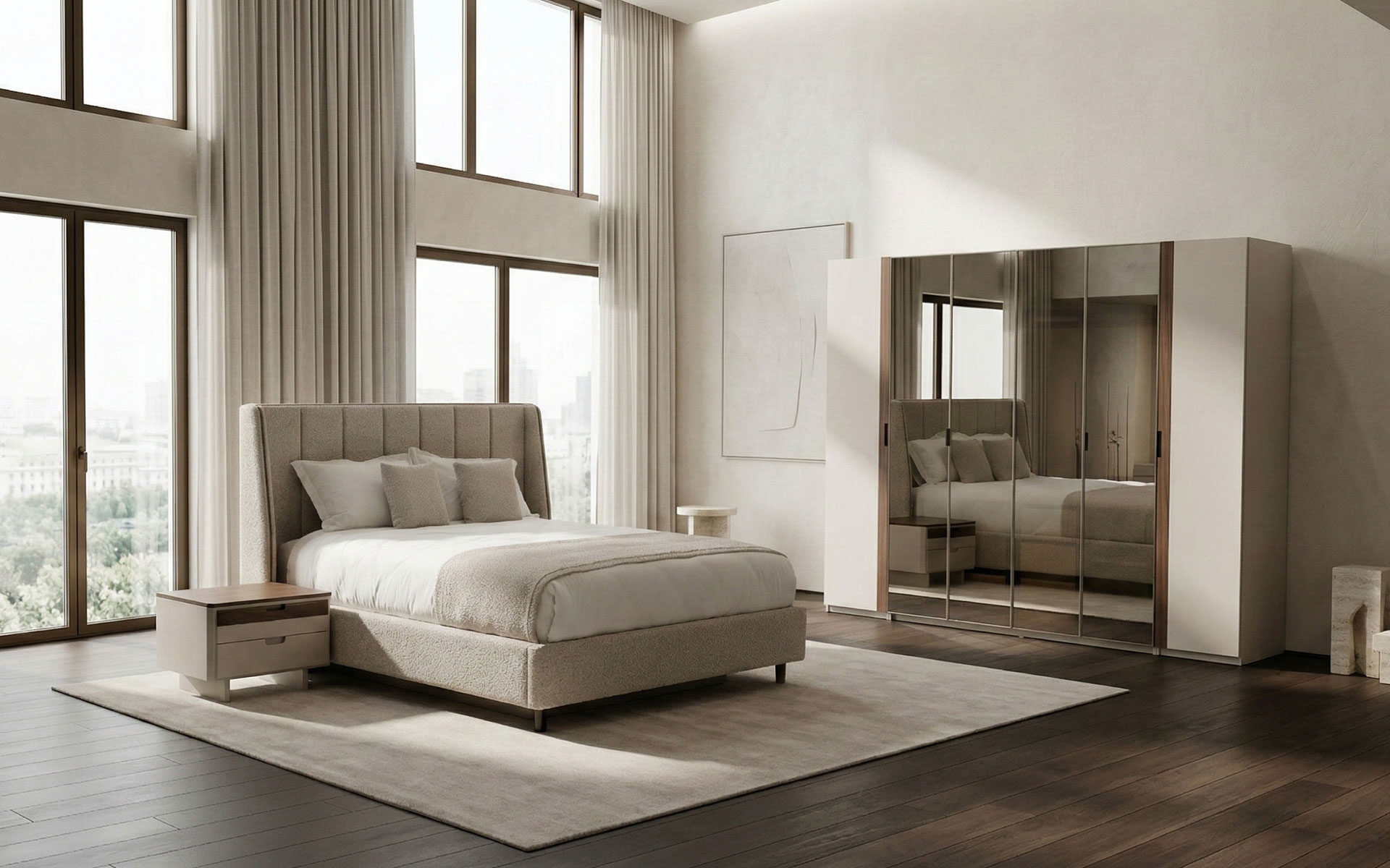 Designed for those who seek a simple yet distinctive atmosphere, the Calma Bedroom blends modern lines with understated elegance. The soothing effect of natural tones brings freshness to the space, while its balanced form creates a harmonious look. Its wardrobe with smart storage solutions, comfort-focused headboard, and finely detailed bedside tables provide practicality for everyday use. Thanks to high-quality materials and careful production details, it maintains its aesthetic appeal for many years, adding lasting elegance to your living space.