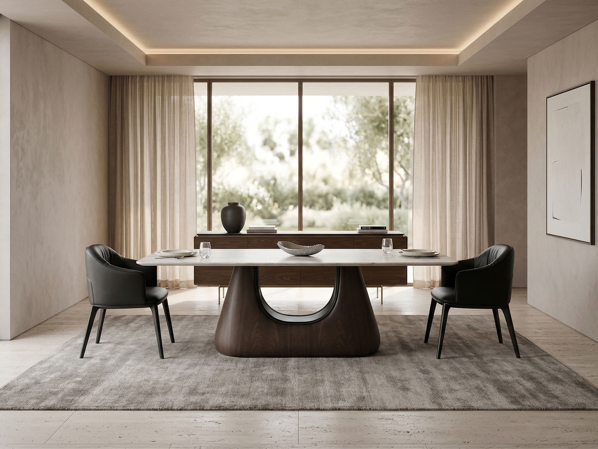 Elia Dining Room V1 brings the freshness of the sun and the purest forms of nature into your living space. Standing out with its fine lines and eye-soothing minimalist silhouette, this design creates a bright and spacious atmosphere in your dining room. The holistic aesthetics felt in every piece, from the elegant leg structure of its table to the refined surface details of its console, make Elia not just a dining room set but a design object that lightens the soul of the space. That special point where simplicity meets high aesthetics...