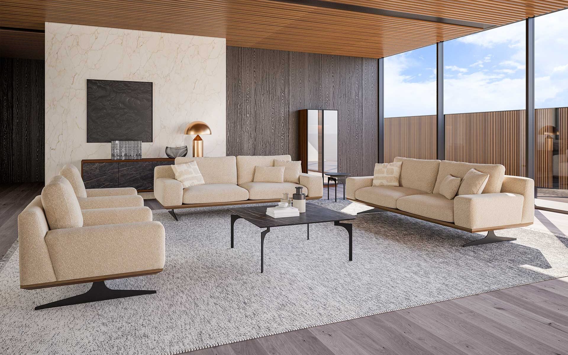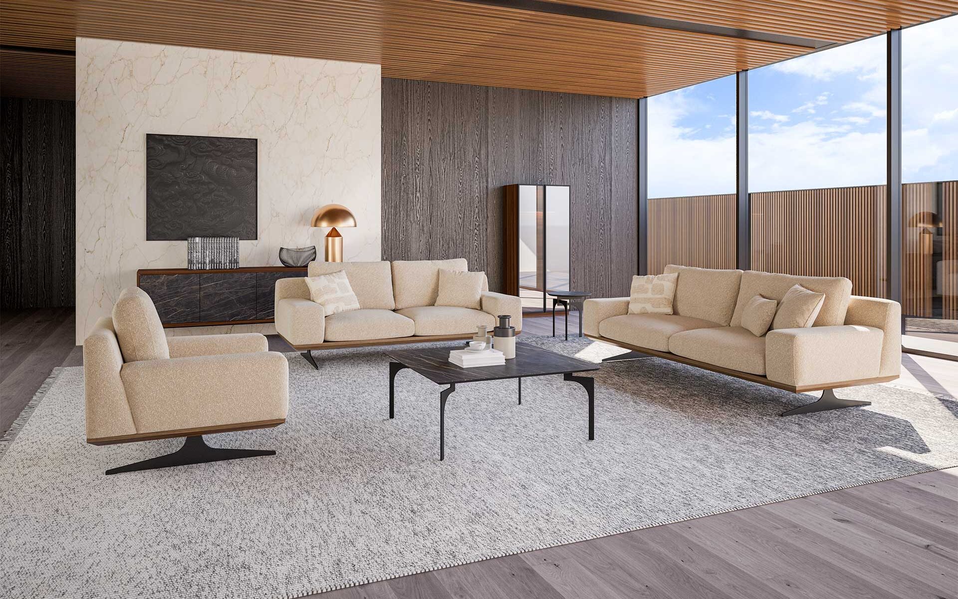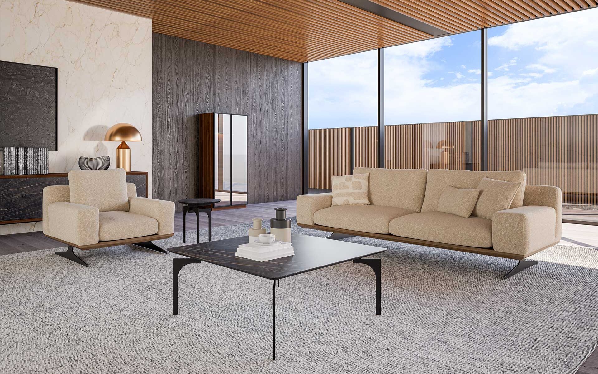 Setul de Canapea Elegant Vol1 adaugă sofisticare spațiului dumneavoastră de locuit prin designul său elegant și rafinat. Tapițeria din material de înaltă calitate și zonele de ședere confortabile fac fiecare moment plăcut, în timp ce liniile simple și detaliile elegante aduc o atmosferă rafinată în camera dumneavoastră. Picioarele fine din metal și detaliile de cusătură atent lucrate consolidează postura modernă a designului. Elegant Vol1 combină perfect eleganța și funcționalitatea, fiind o alegere ideală pentru cei care caută stil și confort.