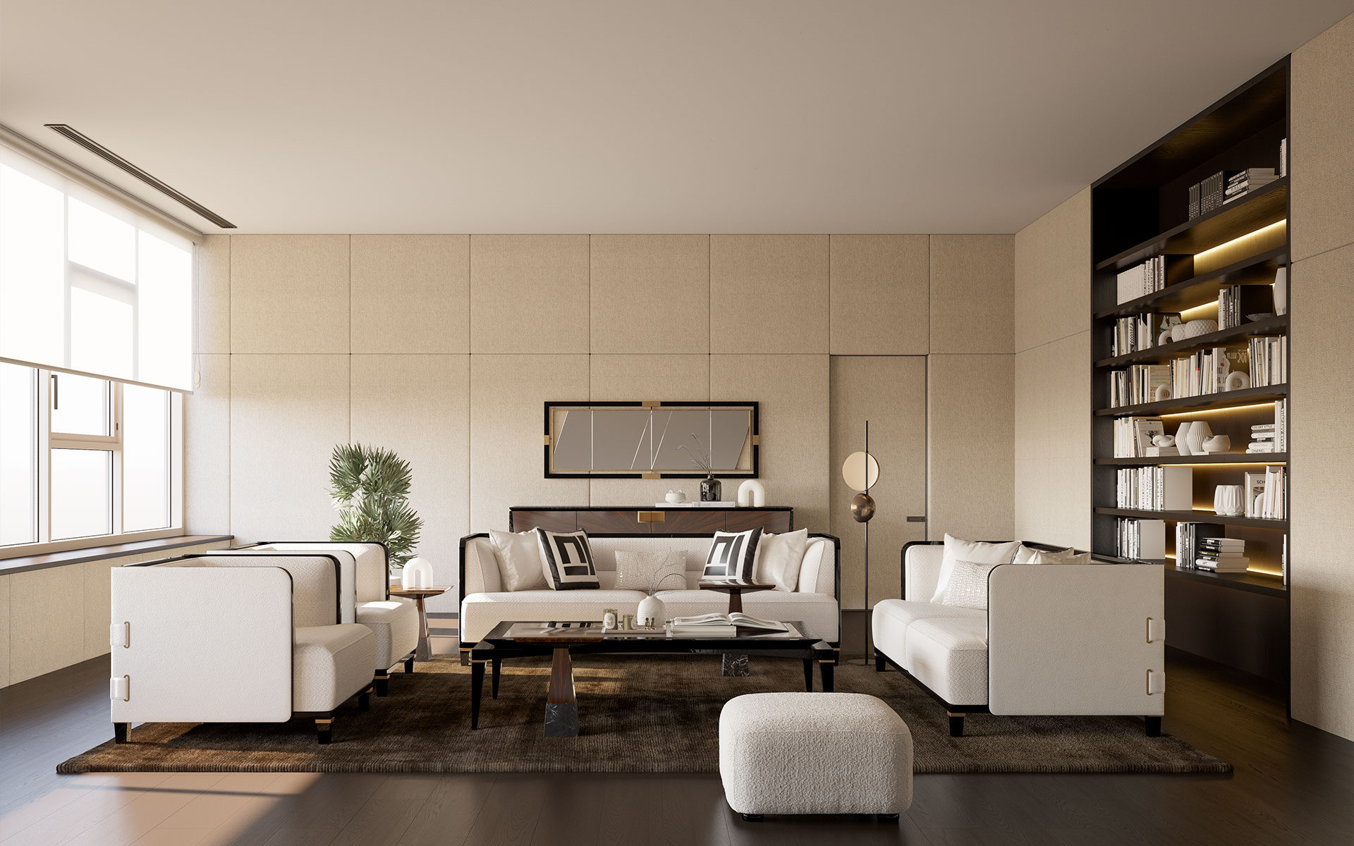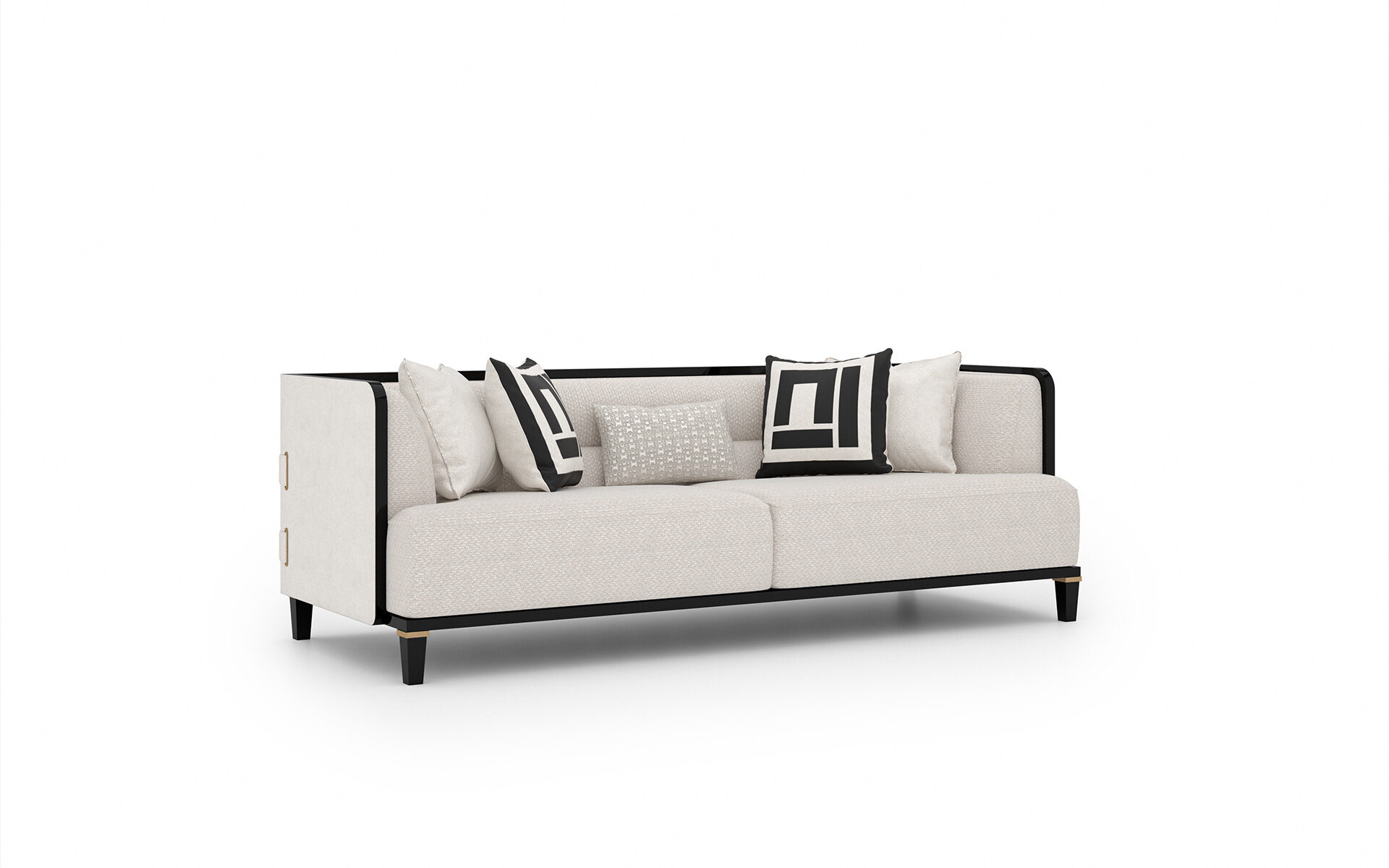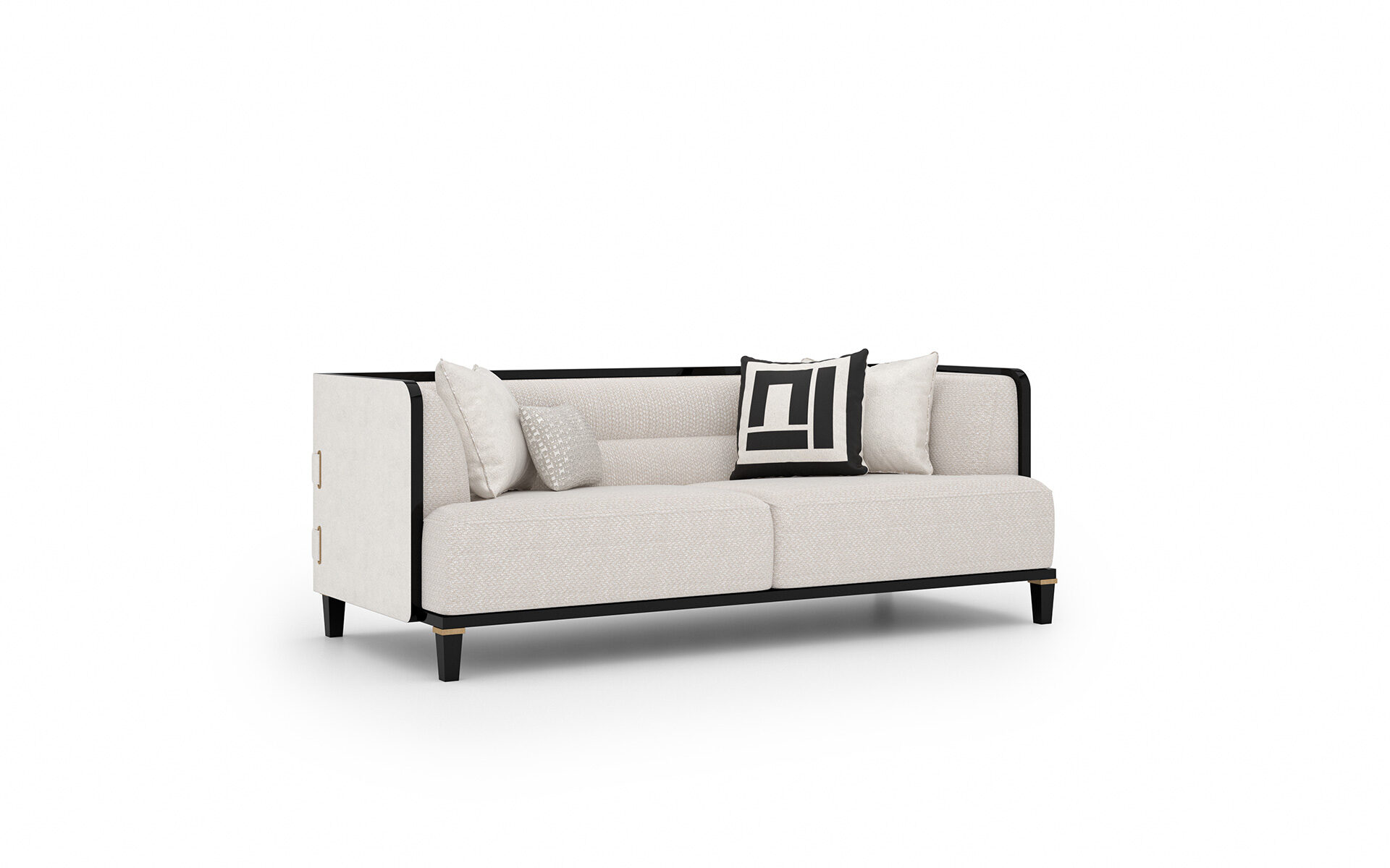 Setul de Canapele Kant îmbină căldura lemnului natural cu rafinamentul culorii negre, aducând împreună elemente de design modern și clasic. Pernele cu densitate mare din zonele de ședere oferă un confort deosebit chiar și în utilizarea îndelungată. Picioarele din lemn de fag sunt evidențiate prin detalii din lac negru și alamă antichizată, în timp ce cadrul solid și tapițeria din țesătură chenille-in garantează durabilitate și eleganță.