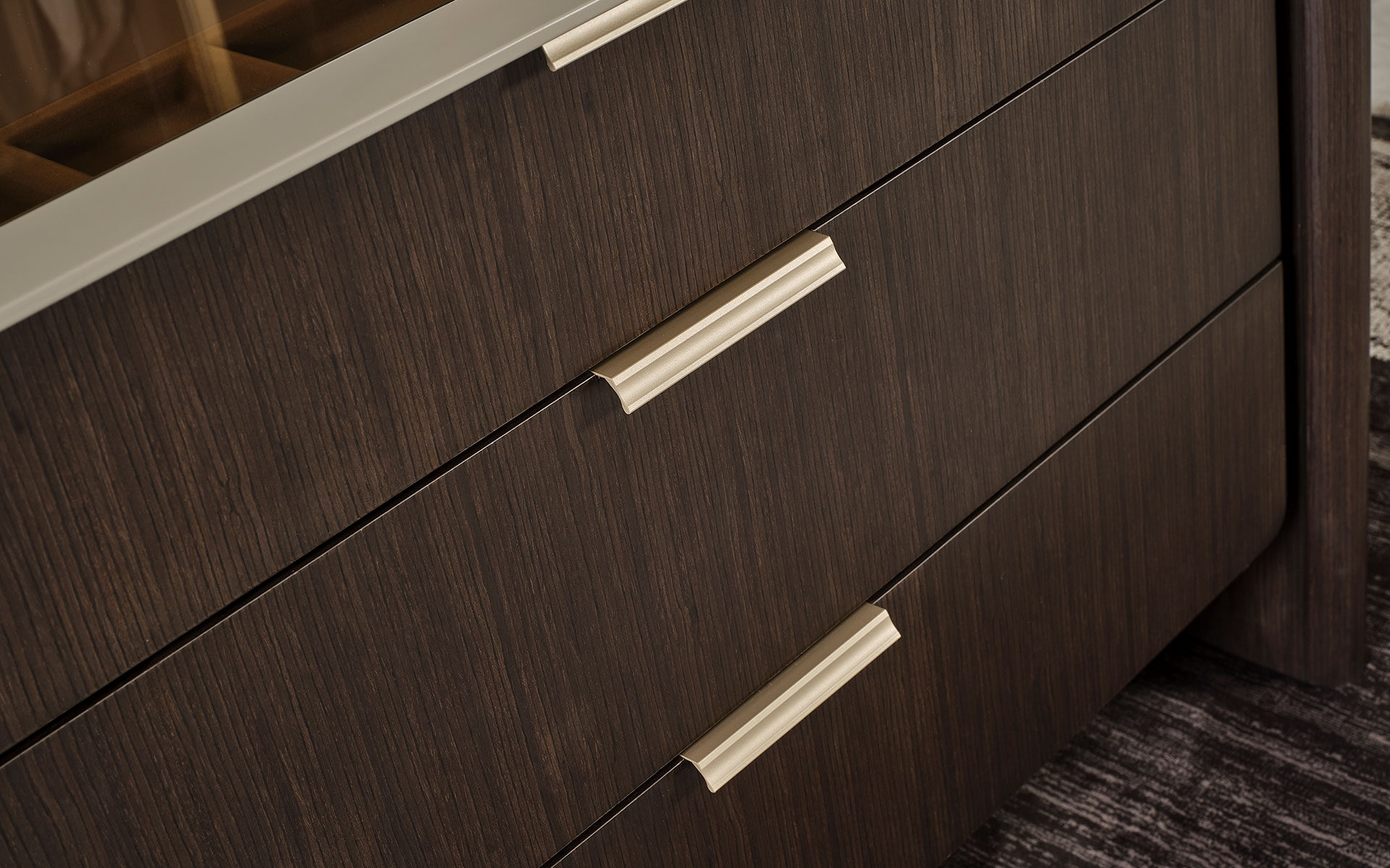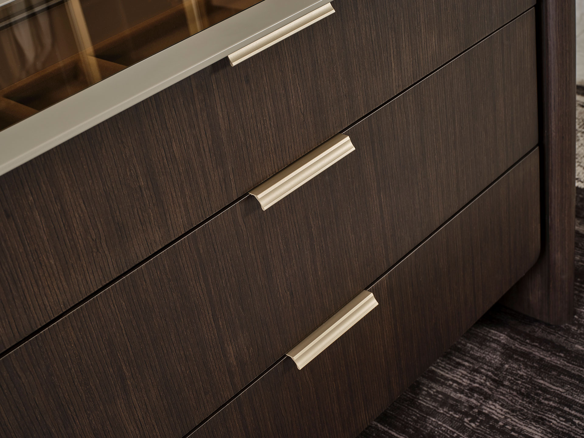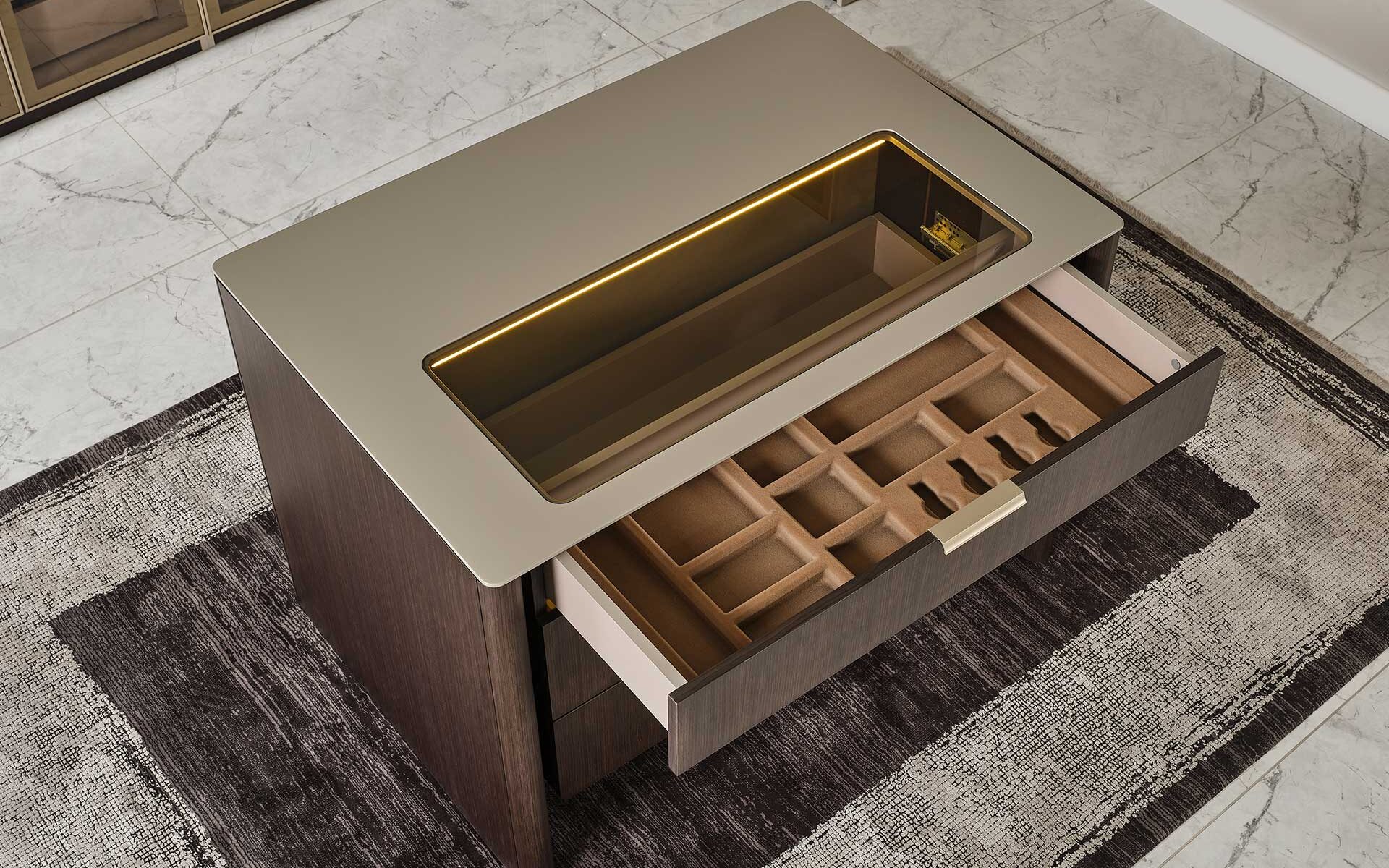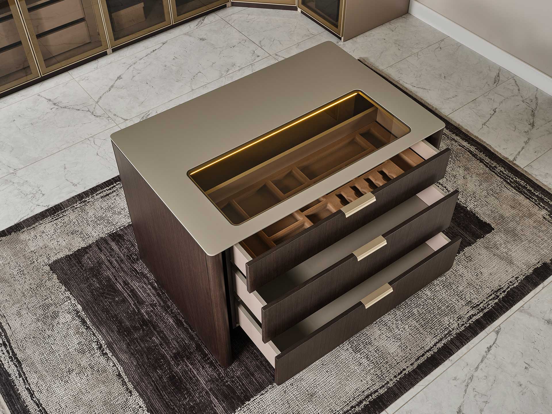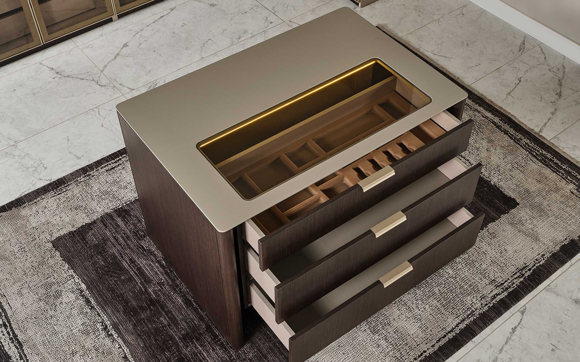 Modulul insular Terra este amplasat în centrul sistemelor modulare de dulap din dormitor, oferind atât eleganță, cât și funcționalitate suplimentară. Datorită structurii sale funcționale, oferă spațiu suplimentar de depozitare prin compartimentele cu sertare și rafturi, în timp ce suprafața superioară creează un loc ideal pentru obiecte decorative, iluminat sau articole personale. Combinând căldura nuanțelor naturale de lemn cu liniile moderne, Modulul insular Terra completează estetic designul dulapului, fiind o alegere perfectă pentru cei care caută ordine și armonie vizuală în dormitor.