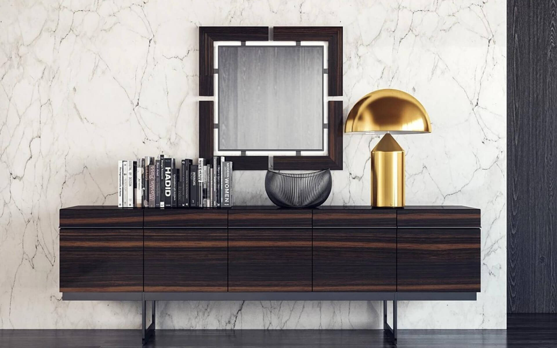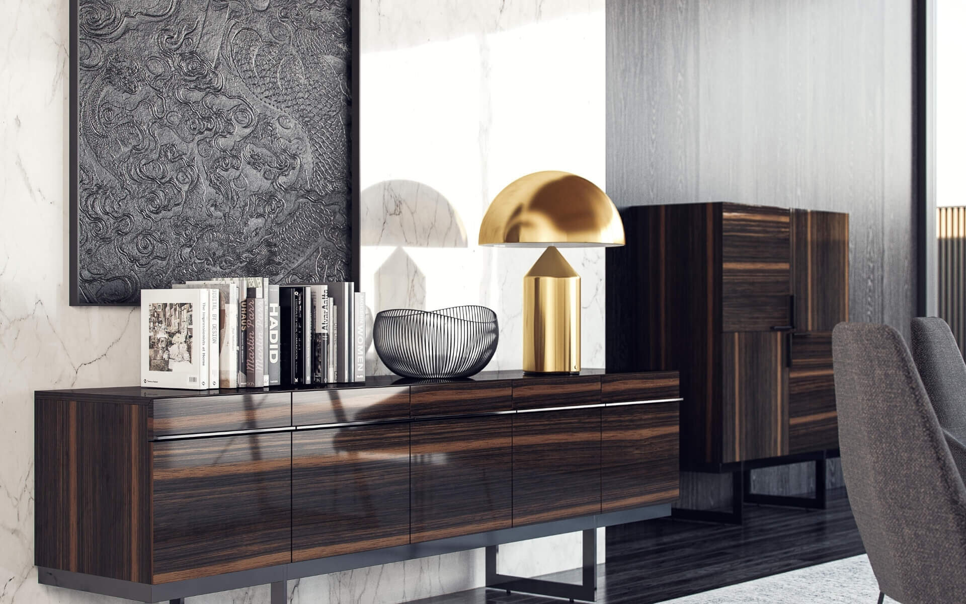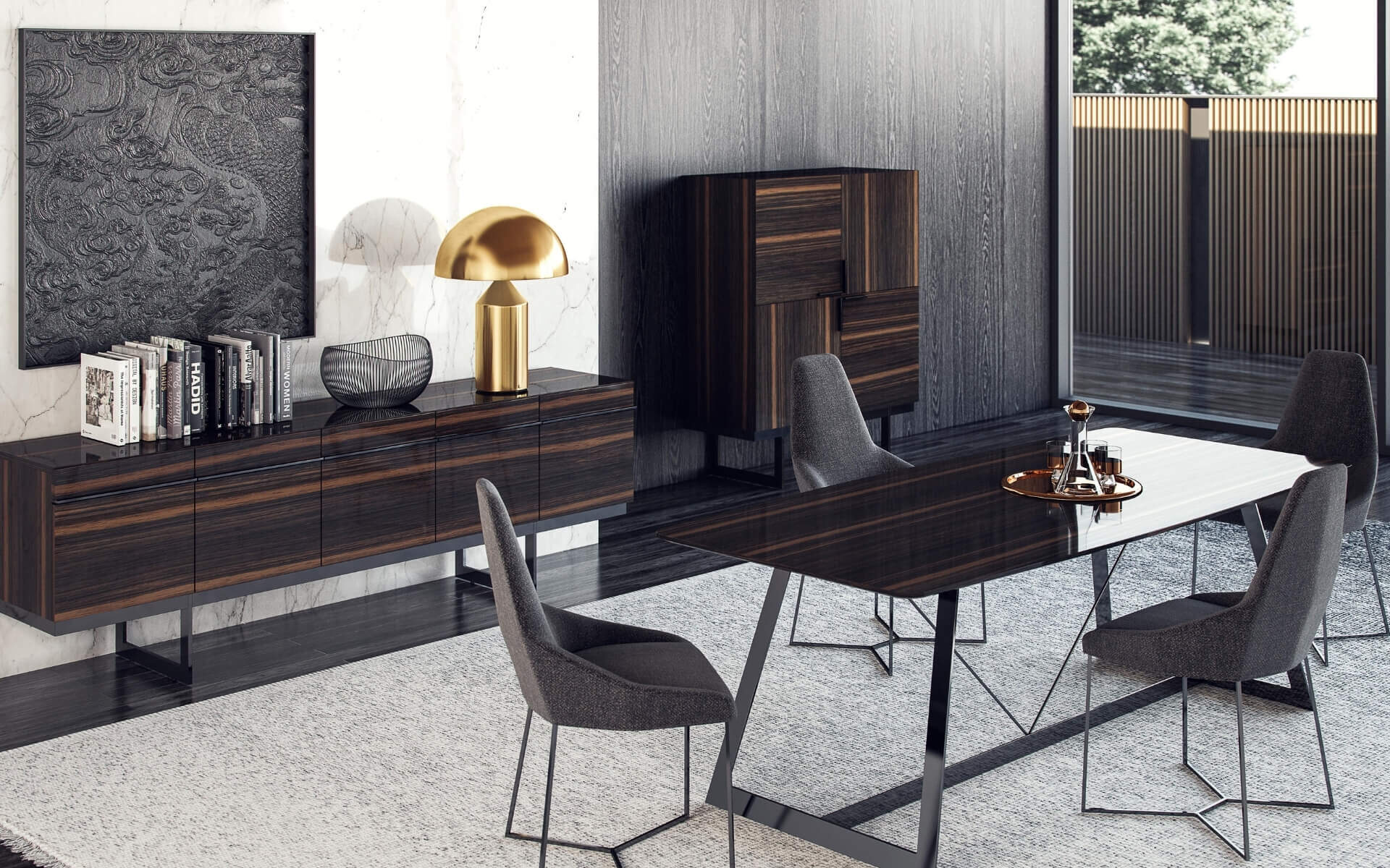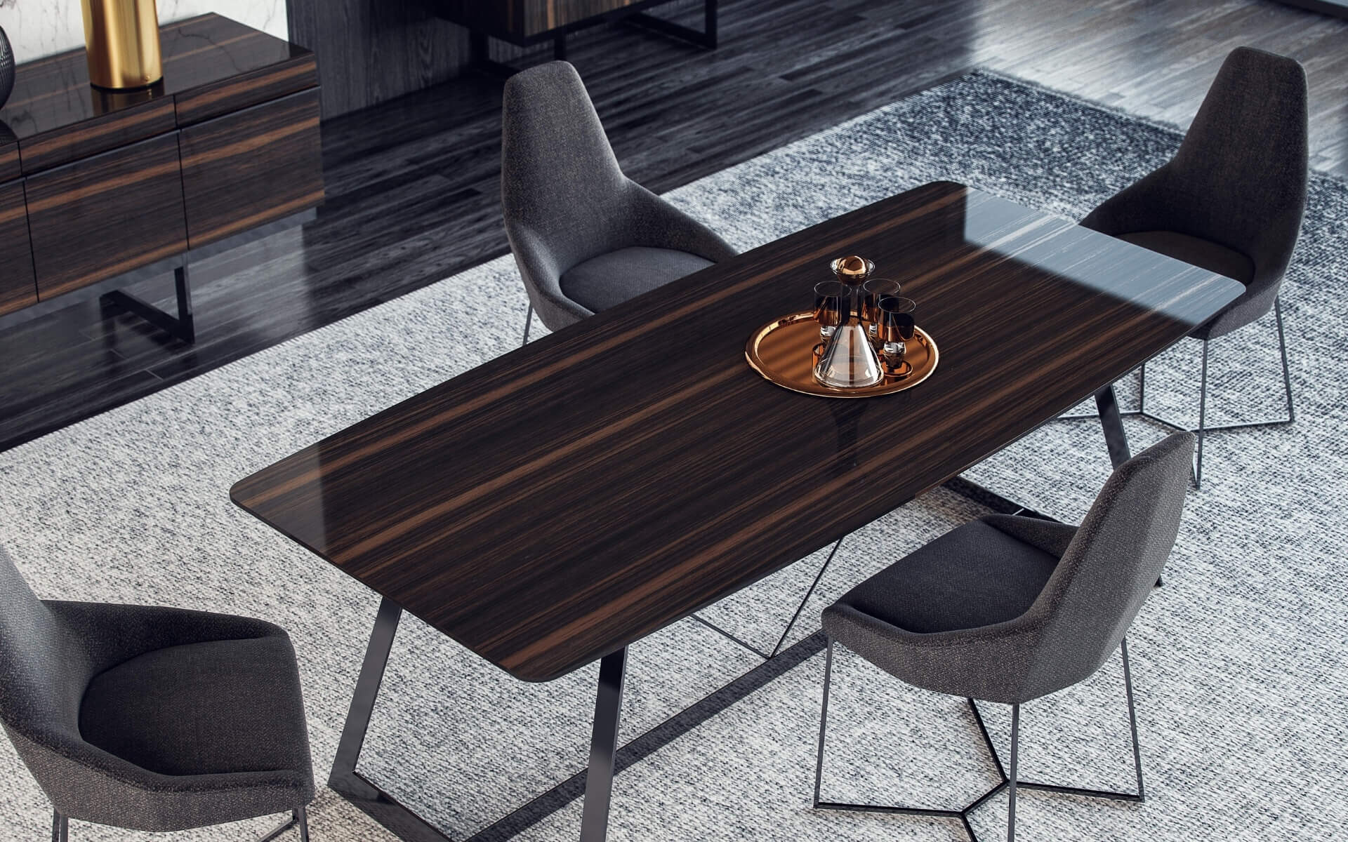 Элегантная столовая, отделанная натуральным шпоном эбенового дерева, излучает благородство благодаря характерным тёмным тонам. Ножки обеденного стола и стульев из дымчатого металла поражают своим дизайном.
